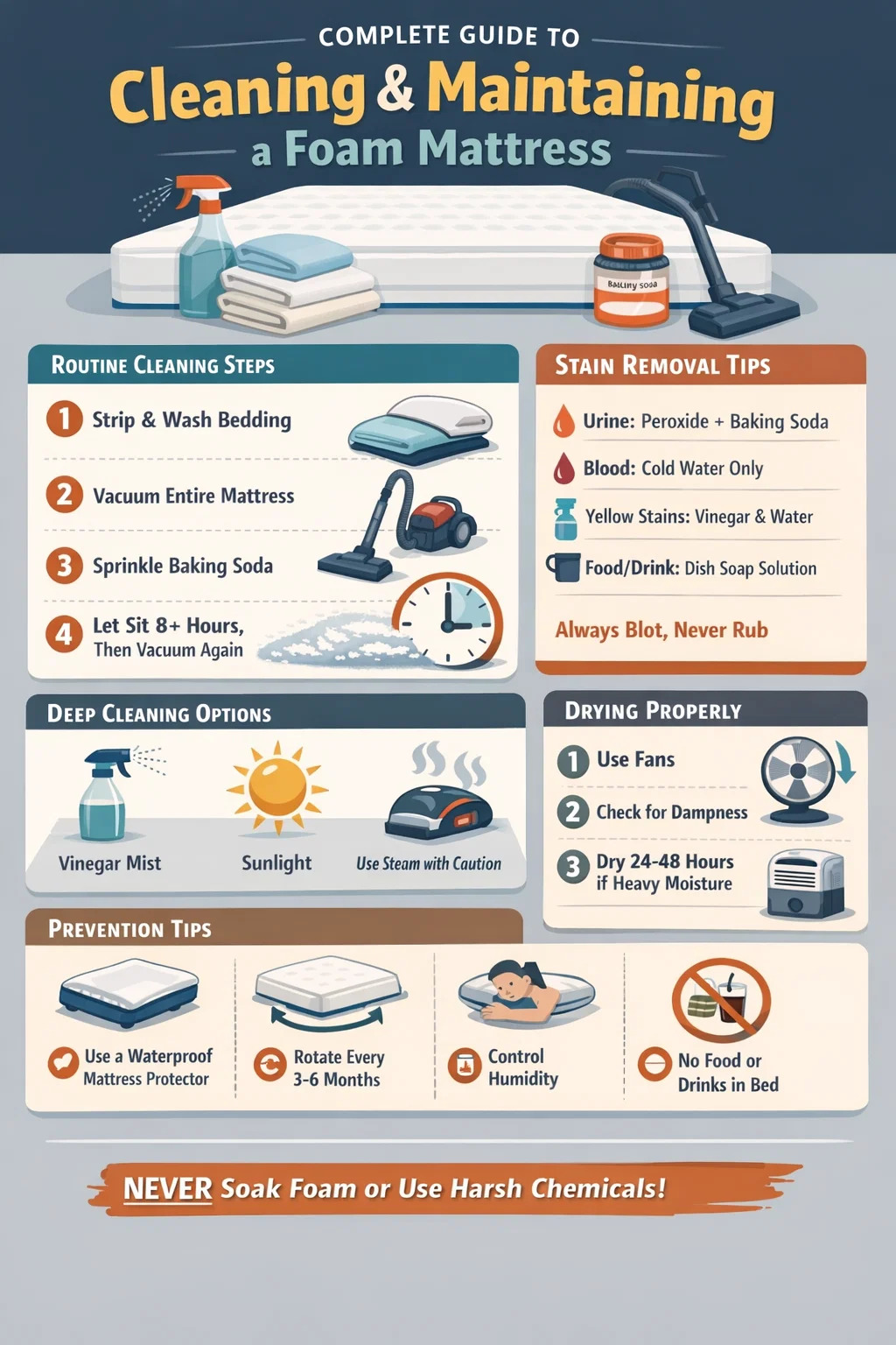 - Ігнорування інструкцій виробника по догляду: У деяких матрацах з піни з ефектом пам’яті використовуються спеціальні запатентовані склади піни, які можуть мати особливі вимоги щодо догляду. Завжди перевіряйте етикетку догляду або веб-сайт виробника, перш ніж використовувати будь-який метод очищення вперше.