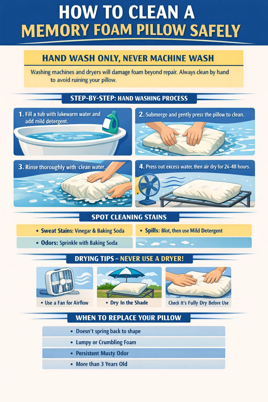 Єдине найважливіше правило під час чищення подушки з пінопласту — особливо подушки з піни з ефектом пам’яті — таке: ніколи не кладіть його в пральну машину або сушильну машину . Цикл перемішування розриває структуру піни з відкритими комірками, а тепло від сушарки руйнує в’язкопружні сполуки, які надають піні з пам’яттю властивостей скидання тиску. Подушка з піни з ефектом пам’яті, яка пройшла навіть один цикл машинного прання, ніколи не відновить свою первісну форму.