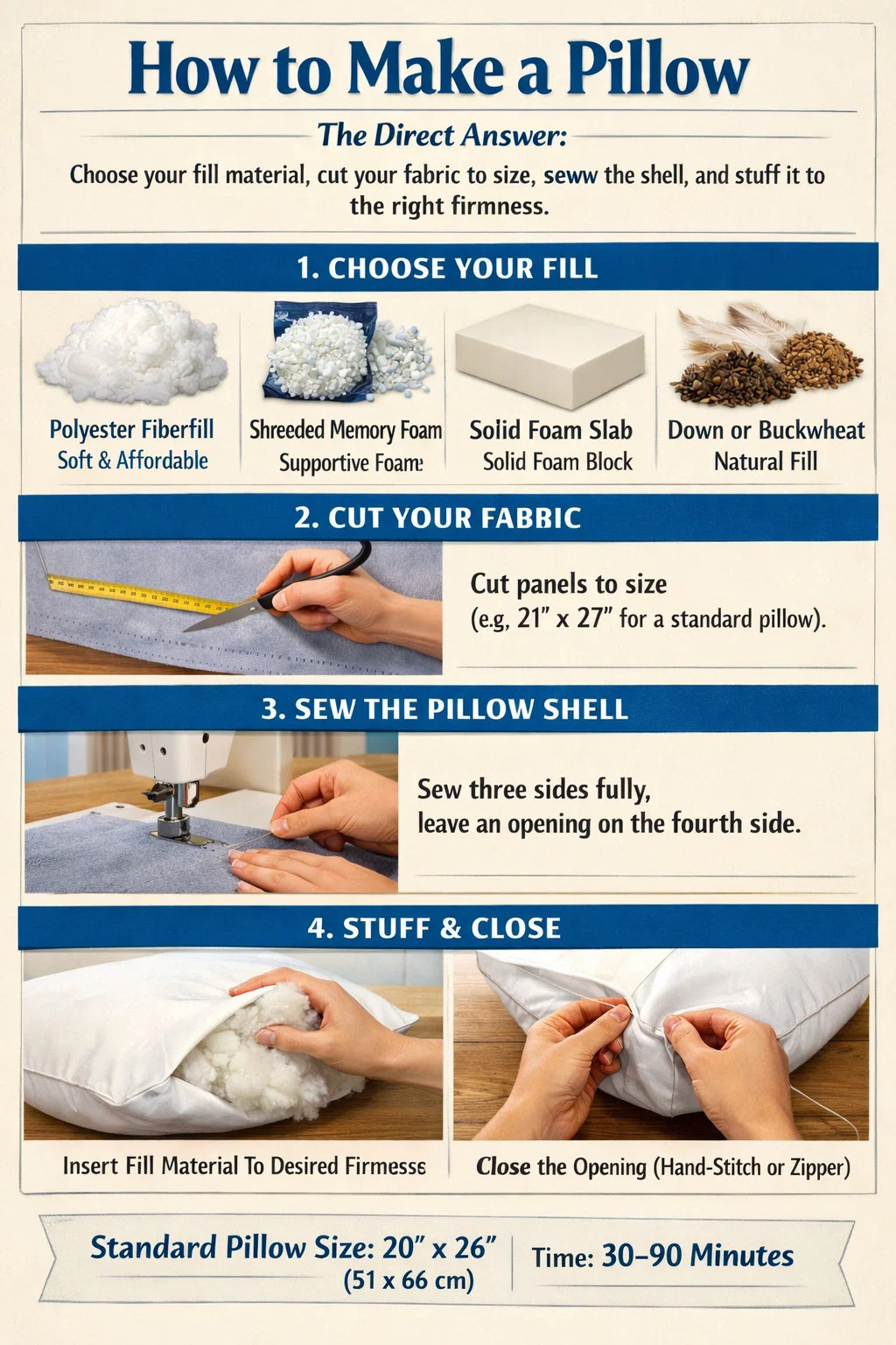 Виготовлення подушки зводиться до чотирьох основ: виберіть матеріал наповнювача, виріжте тканину за розміром, зшийте оболонку та набийте її до потрібної жорсткості. Для більшості людей, стандартна подушка для ліжка має розміри 20 × 26 дюймів (51 × 66 см) , а весь процес — від розрізання тканини до закриття остаточного шва — займає від 30 до 90 хвилин залежно від типу заповнення. Якщо ви працюєте з подушкою з піни з ефектом пам’яті, процес дещо відрізняється, оскільки ви ріжете або подрібнюєте піну, а не наповнюєте її пухкими волокнами, але структурний підхід залишається тим самим.