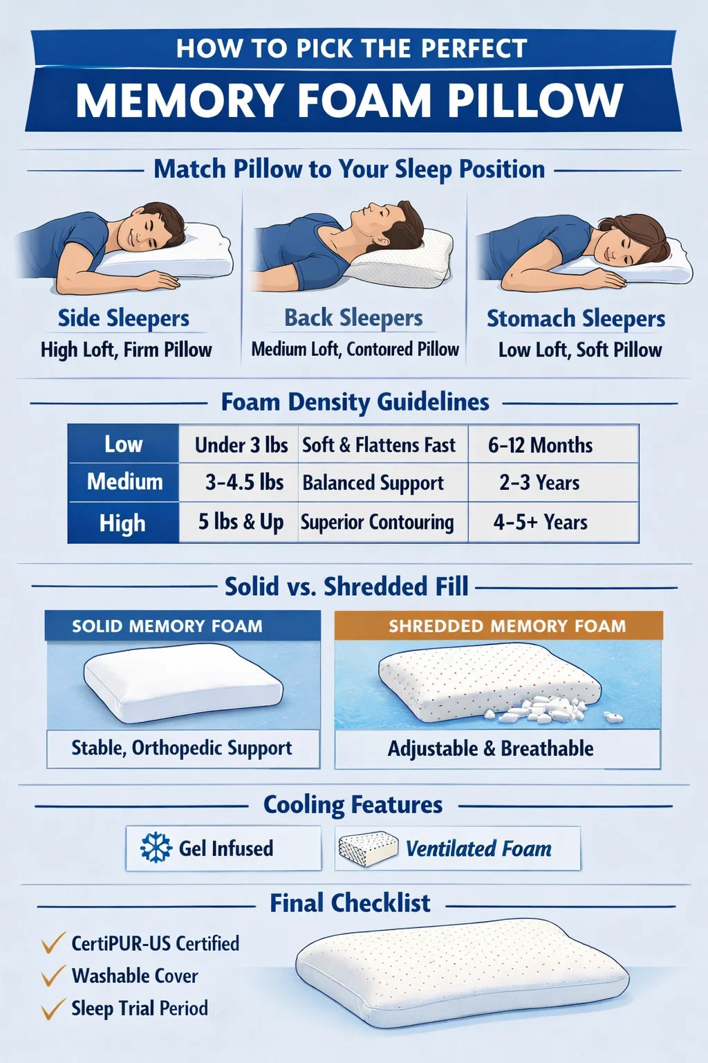 Щоб правильно вибрати подушка з піни пам'яті , ви повинні відповідати «висоті» (висоті) і «твердості» подушки відповідно до основного положення під час сну. Люди, які сплять на боці, повинні вибрати високу, тверду подушку, щоб заповнити проміжок у плечах; тим, хто спить на спині, потрібна подушка середньої висоти з контуром шиї; і шлунки вимагають дуже тонкої, м’якої піни або подрібненого наповнювача. За межами позиції завжди перевіряйте щільність піни (прагніть до 3,5 фунтів/фут³ або вище), щоб забезпечити тривалу довговічність і підтримку.