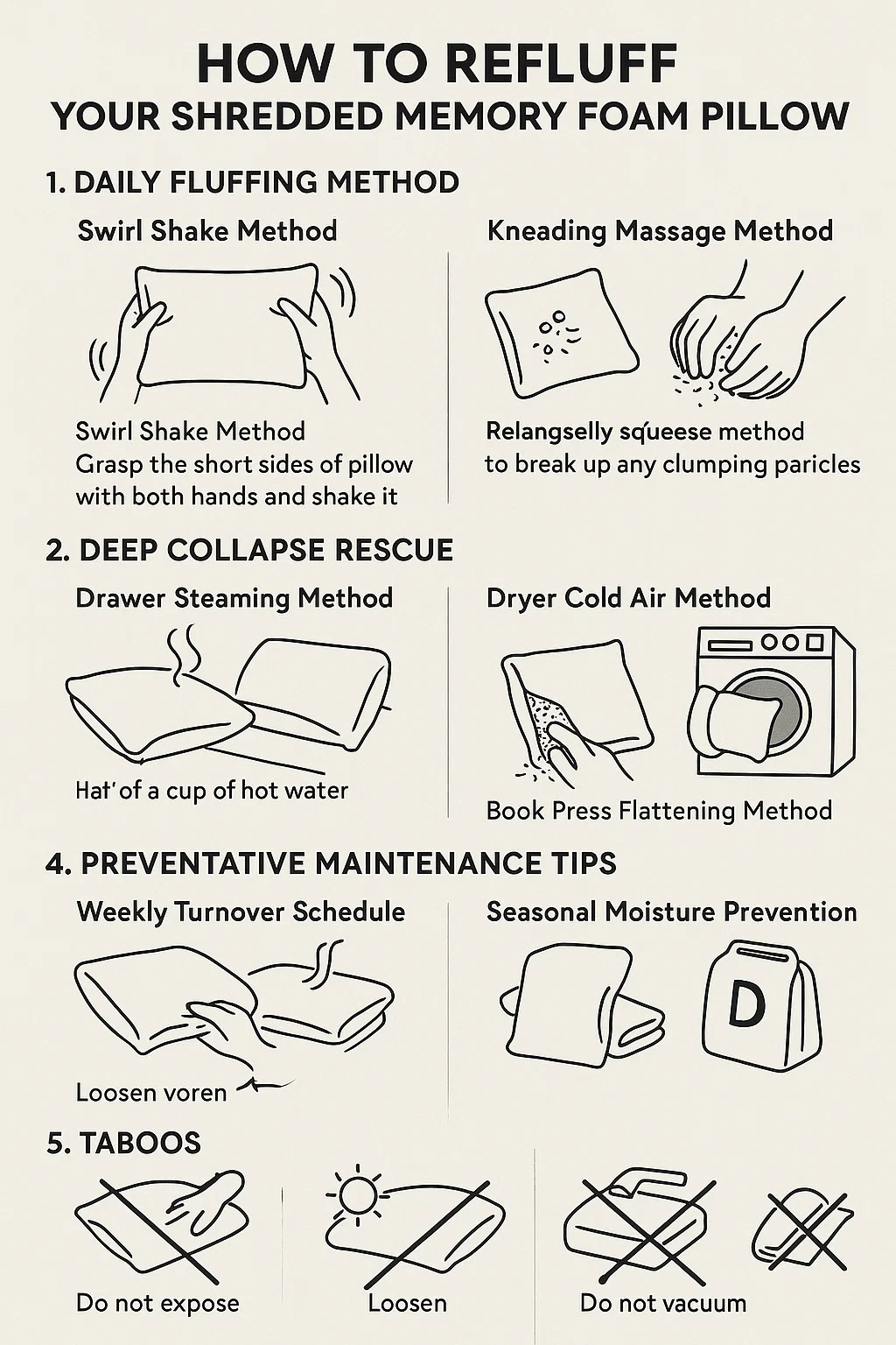 Сезонна профілактика вологи: Під час сезону дощів загорніть подушку в мішок з осушувачем і зберігайте 2 години (щоб запобігти поглинанню вологи та ставати липкими).
